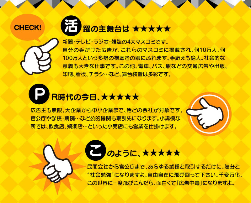 我社の仕事は、野球のバッターに例えると、左右両翼やセンターなど全方向に打ち分ける広角打法です。営業の対象は幅広く、大会社や中小企業、官庁から飲食・娯楽店まで、あらゆる業種を網羅しています。 広告会社によっては、一部の業種だけや一定の地域だけを担当する営業方式を採用している所が案外、多いものです。その点、我社は取扱い業種や担当地域に制限はなく、あらゆる業種、あらゆる地域を対象に、自由に活動できます。このため、視野を広め、多彩な人生経験を積みたい—と望む人には、最適の職場でしょう。 |